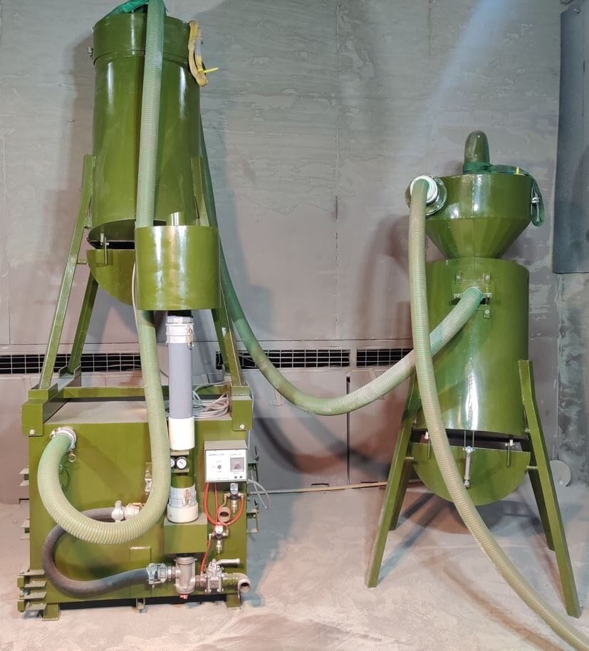 All material is recovered through the gulper suction head and drawn via the rubber lined hose into the cyclone. The vortex created separates the very fine dusts from the heavier particles which fall, under gravity, into the hopper. A dump valve on the hopper is operated by an adjustable timer which can be set to suit the recovery.