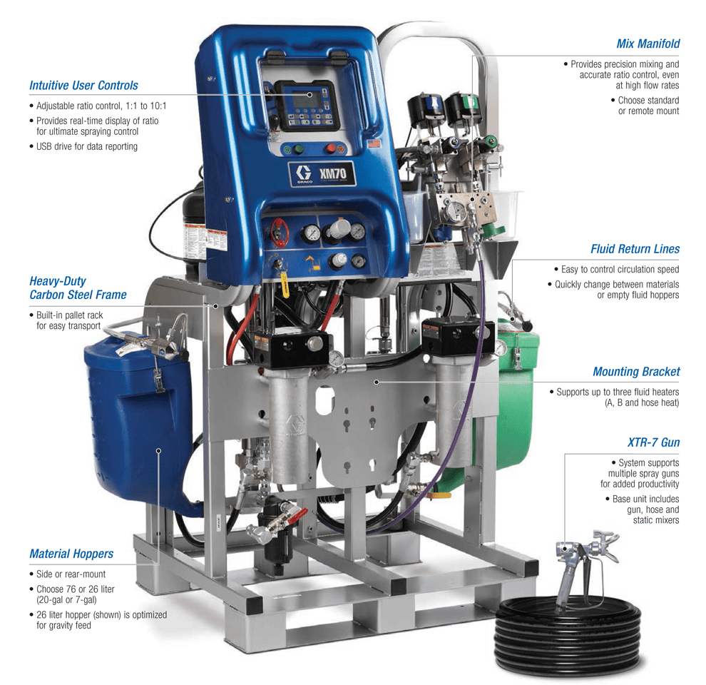 - More flexibility means more affordability With Graco XM Plural-Component Sprayers, you have the flexibility to select the essential equipment on your system – no more, no less – to complete your jobs accurately and reliably. If your application does not require heaters, feed pumps or hoppers, this flexibility may provide you with a lower cost option.